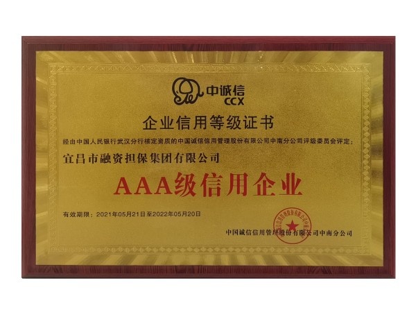 近日,宜昌市融資擔(dān)保集團(tuán)有限公司(以下簡稱宜昌擔(dān)保集團(tuán))被中國誠信信用管理股份有限公司(以下簡稱中誠信)評定為“AAA級信用企業(yè)”。