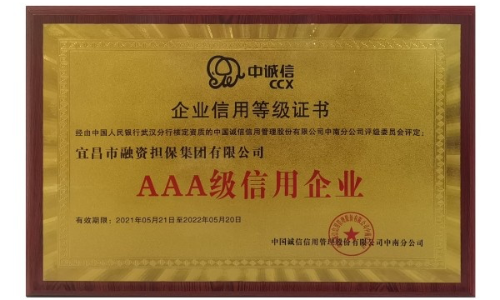 近日,宜昌市融資擔保集團有限公司(以下簡稱宜昌擔保集團)被中國誠信信用管理股份有限公司(以下簡稱中誠信)評定為“AAA級信用企業(yè)”。