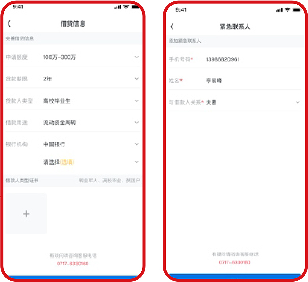 若貸款人為專業(yè)軍人、高校畢業(yè)生、貧困戶則需要上傳相關(guān)證書,確認無誤后點擊保存,并添加緊急聯(lián)系人。