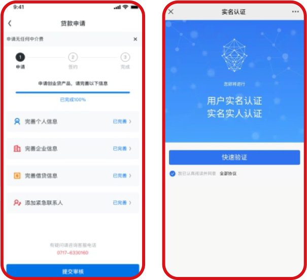 所有信息填寫完成后,頁面上方將顯示完成100%,提交審核后再次進行,人臉識別,核查真實意愿。