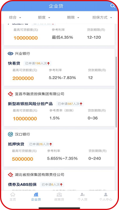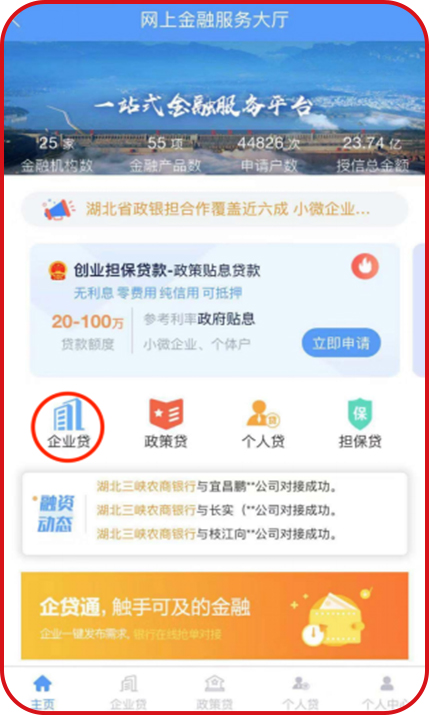 進入“市民e家”App并登錄-選擇[金融大廳]-點擊下方 [企業(yè)貸] -進入創(chuàng)業(yè)擔保貸款界面