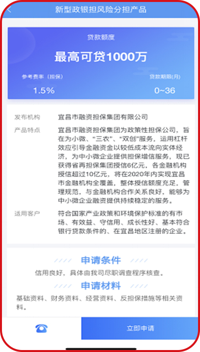 進入申請進入[新型政銀擔風險分擔產(chǎn)品]點擊[立即申請]