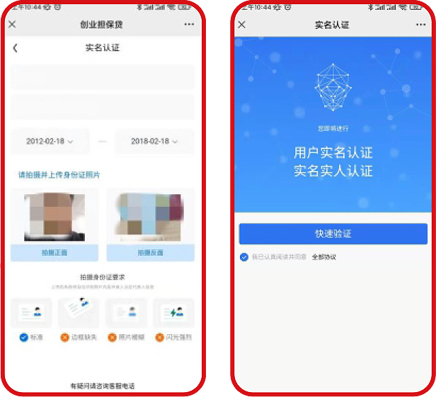 輸入姓名、身份證號并且上傳身份證正反面照片進行實名認證,并做好人臉識別。