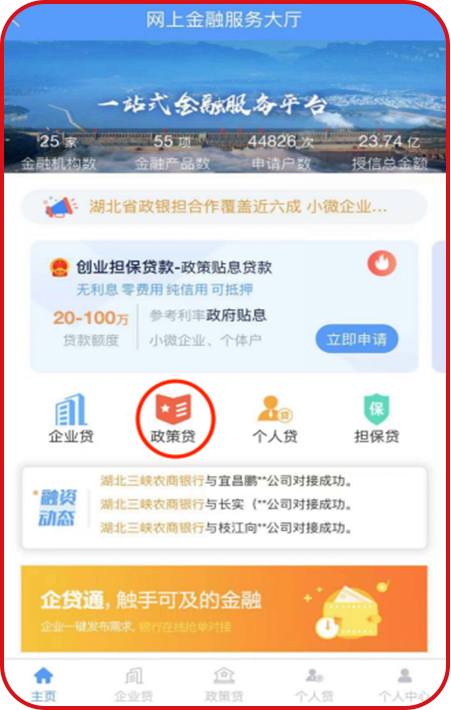 進入“市民e家”App并登錄——選擇【金融大廳】——點擊下方【政策貸】——進入個人創(chuàng)業(yè)擔保貸款界面。