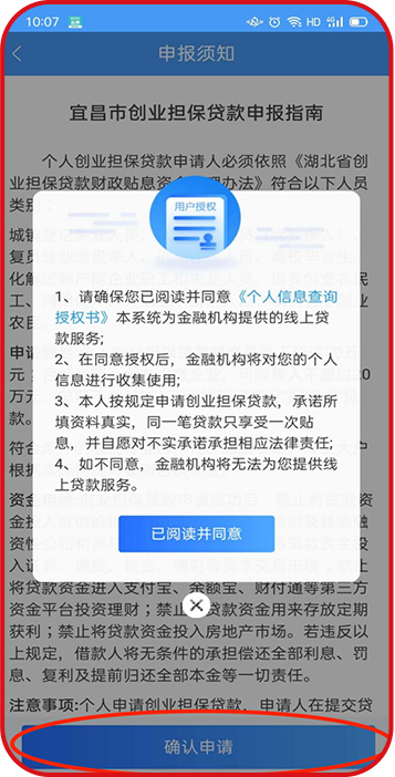 點擊【立即申請】——詳細閱讀《宜昌市創(chuàng)業(yè)擔保貸款申報指南》——點擊【已閱讀并同意】——【確認申請】