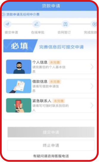 逐項完善個人信息—借款信息—緊急聯(lián)系人信息,進行人臉識別后提交申請。
