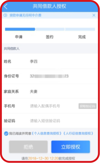 若申請人已婚,則還需申請人配偶進行填寫聯(lián)系人電話及驗證碼,完成人臉識別后提交。